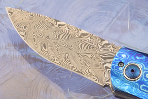 Handle scales are marble carbon fiber, set on anodized titanium liners. Jimping on the thumb rest provides a comfortable, secure grip. Heat colored Timascus bolsters meet perfectly with the handle scales. The external pivot is textured and heat colored. Textured and anodized titanium liners surround the Timascus backspacer. The Timascus pocket clip is mounted for right-side, tip up carry.