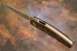Gold Dark Matter FatCarbon handle scales are set on titanium liners. An external Rausch titanium pivot is surrounded by a titanium pivot collar. The 3D machined titanium pocket clip is mounted for tip-up, right-side carry.