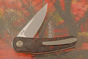 Red Dark Matter FatCarbon handle scales are set on titanium liners. A titanium pivot is surrounded by a titanium pivot collar. The 3D machined titanium pocket clip is mounted for tip-up, right side carry.