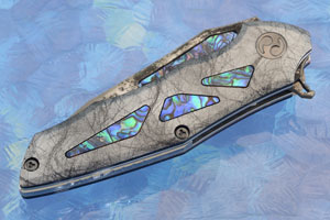 The ergonomic handle is constructed from shinkai copper and features abalone inlays. The 420 stainless steel liners surround the titanium backbar. The shape gives you a rock-solid grip in both the forward and reverse grips and Dew used DLC Microtech tamper-proof screws to put this knife together. A small finger choil provides a perfect rest for precise cutting tasks. Jimping on the thumb ramp ensures a secure grip. The 420 stainless steel pocket clip is mounted for right-side, tip-up carry.