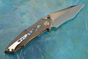 The handle is DLC coated titanium set on mirror polished 420 stainless steel liners. Six abalone shell inlays are perfectly inlaid into both sides of the knife. The liners surround a matching mirror polished, DLC coated titanium backbar. The 420 stainless steel pocket clip is mounted for right-side, tip-up carry.