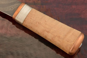 Stabilized birdseye maple handle scales are surrounded by a copper pommel and guard. The front of the handle is set with silver wire, providing a secure, comfortable grip.