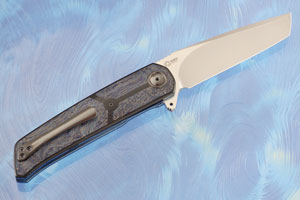 Handle scales are black G-10 with three sections of blue dyed and stabilized oak burl inlaid on both sides of the handle. The gently rounded handle feels sturdy and fills your hand perfectly. Blue anodized titanium liners surround a black carbon fiber backbar. The custom pivot and collars are heat colored zirconium. The matching 3D machined zirconium pocket clip is mounted for right-side, tip-up carry.