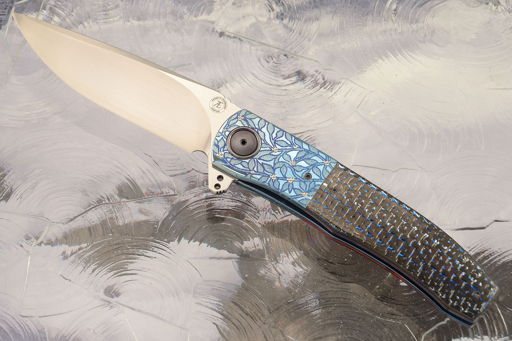 Handle: Blue/silver carbon fiber set on fileworked and anodized titanium liners