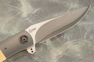 Handle scales are antique Westinghouse Micarta. This Micarta was developed in 1910 by Westinghouse Electric Corporation as an industrial thermo-set laminate for electrical insulation. This light toned Micarta was lost in a warehouse and only recently discovered. The top shows the beautiful yellowing with age that makes this Micarta so captivating. A few years ago, this antique Micarta was extremely rare -- now it is virtually impossible to find. The scales are fit perfectly to blackened zirconium bolsters. Both the external pivot and collars are also matching blackened zirconium. Jimping on the thumb ramp provides a comfortable, secure grip. The gently rounded handle feels sturdy and fills your hand perfectly. The handle is completed with bronze anodized titanium liners and red fiber spacers. The 3D machined TiAlN coated titanium pocket clip with ceramic retention ball is mounted for right handed, tip-up carry.