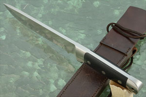 This massive camp knife is fully integral, meaning the blade, tang, and front and rear bolsters are made from one solid piece of steel. This gives the knife dramatically higher strength and durability. The blade is S-7 tool steel, well known for its high durability and shock resistance. The spine is a whopping 1/4 inch thick, but a deep hollow grind provides excellent slicing ability. Edmund's touchmark is on the left side of the blade.