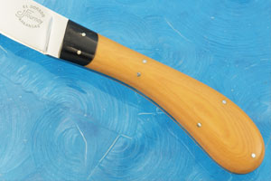 The scales are vintage Micarta set on a full tang using five stainless pins. The bolsters are dovetailed to buffalo horn bolsters. The tang is distal tapered, lightening the knife and giving it a perfect balance in hand. The contoured scales feel great and provide a comfortable grip.