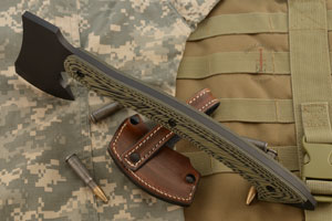 The handle is fluted green/black camo G-10 secured to the full tang using torx screws. The handle is shaped to allow you to choke up for more detailed tasks like shaving kindling. The beak at bottom of the handle prevents it from slipping during chopping or hammering tasks. A lanyard can be added at the bottom of the handle if desired.