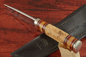 Description: Randy's fascination with knives began as a young man, when he made his first knife in a high school "metal" class. Since then, knifemaking has become a family project for him. Each of his four sons have taken their turn helping in the shop, while his wife, Sonja, makes the sheaths for the knives. This knife was kept in a private collection since it was made. It is in brand new, unused condition and by all appearances Randy could have made it yesterday.
