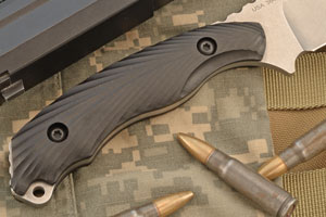 The harpoon blade is CPM-3V carbon steel, providing maximum resistance to breakage and chipping in a high wear-resistant steel. This is an excellent steel for a hard use knife. A stonewash finish helps prevent light reflection and hides scuffs and scratches from use. The thumb ramp is fileworked providing excellent traction.