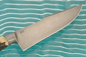 The dramatic damascus blade is hand forged from 1084 and 15n20 carbon steels providing exceptional edge holding and chip resistance. The raised clip stops just short of being fully sharpened and could be sharpened if desired. The spine and choil are nicely rounded for additional comfort. The left side of the blade is stamped with Andrew's maker mark and the right side features his mastersmith stamp.