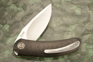 Carbon fiber scales are set on bronze anodized titanium liners. A shred carbon fiber backbar keeps the knife light, yet strong. The 3D machined Damasteel pocket clip is mounted for right-side, tip-up carry.