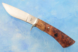 The solid amboyna burl handle is contoured for a very comfortable grip. This unique piece of amboyna burl combines the blonde sapwood toward the front of the handle with the red toned heartwood toward the rear. The combination is immediately captivating. Thin, red fiber and brass spacers alternate at the rear of the guard. These assist the handle to adjust to temperature and humidity changes. The handle is finished with a polished nickel silver guard. The handle feels so natural in the hand, you’ll have a hard time putting it down. A serious field knife for the avid hunter or collector.