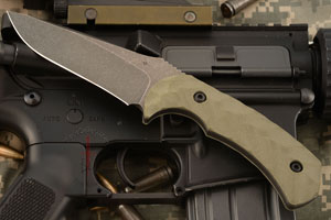 The blade is CPM-154 stainless steel, hardened to 59-61 Hrc. This powdered metallurgical steel has a particularly small grain structure, making it take an extremely keen edge and hold it while remaining tough and chip resistant. Jimping on the spine provides excellent traction and a guard prevents the hand from slipping over the blade during use.