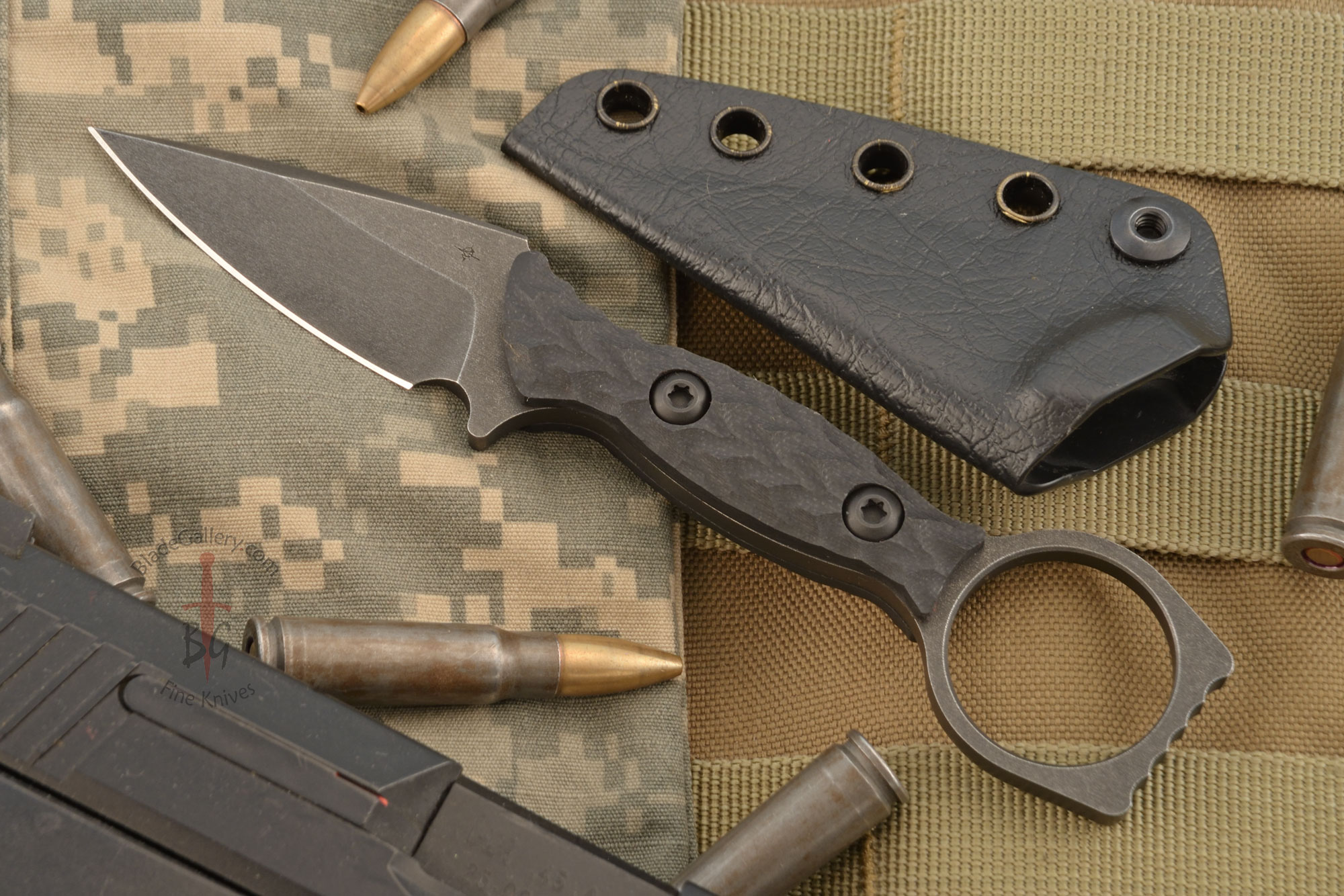 The compact blade is D2 tool steel, hardened to 57-59 Hrc. A thicker tip adds structural stability and a deeper belly ensures an easy slicing cut. A black oxide finish prevents light reflection and provides some limited rust resistance. Jimping on the spine provides excellent thumb purchase, and the one inch ring at the rear makes the knife easy to draw and provides extra retention.