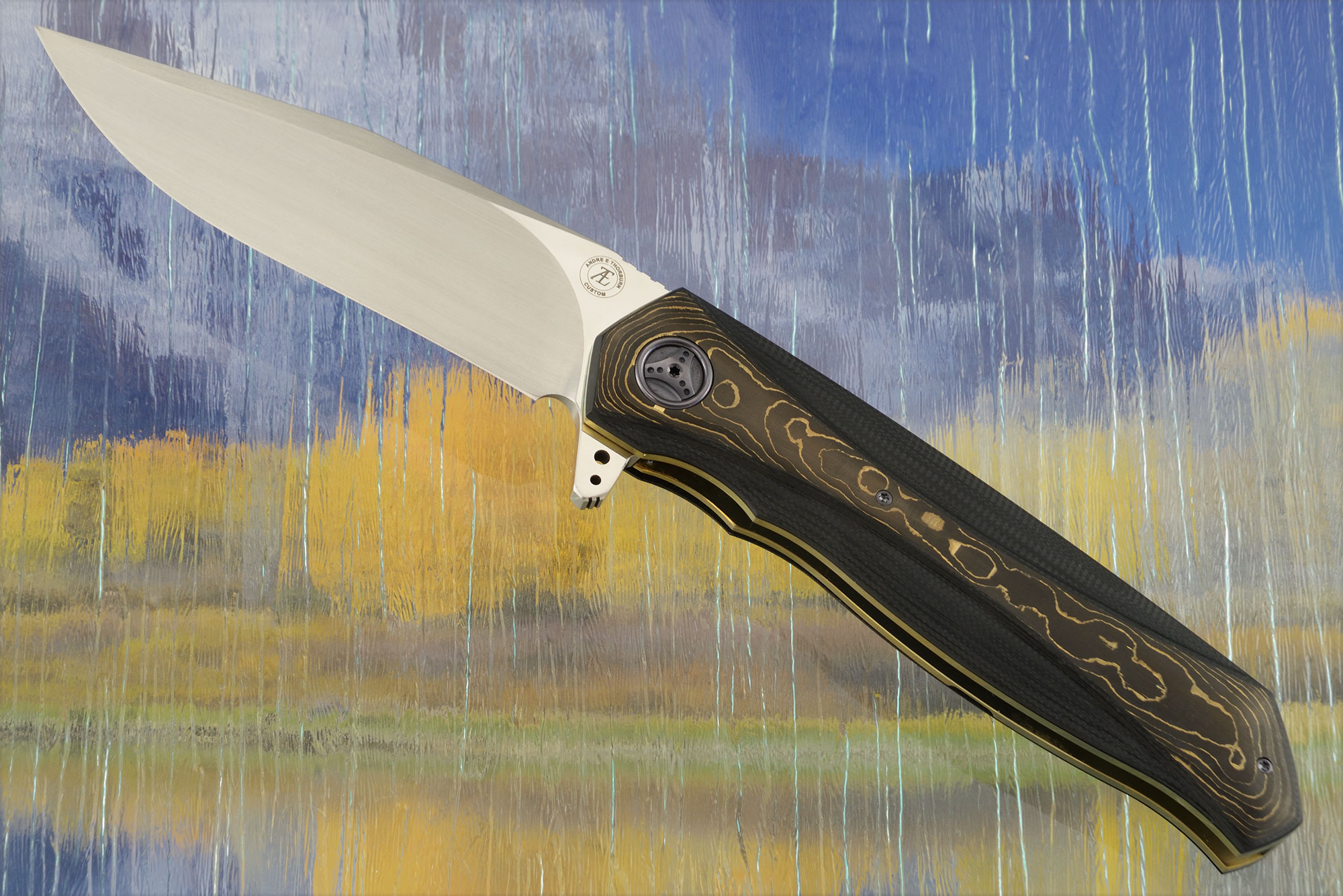 Handle scales are black G-10 with Gold Camo FatCarbon bowtie inlays. The custom external pivot and pivot collar are TiAlN titanium. Jimping on the thumb ramp aids grip. The flipper doubles as a front guard that keeps your hand from sliding forward onto the blade. The gently rounded and 3D contoured handle feels sturdy and fills your hand perfectly. It is completed with differentially anodized, fileworked titanium liners that elegantly contrast against the scales and carbon fiber backspacer. The 3D machined titanium pocket clip is mounted for right-side, tip-up carry and features a ceramic ball for excellent pocket retention.