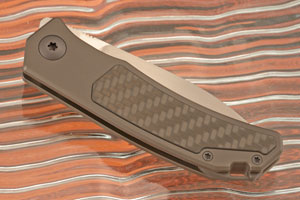 The handle is darkened grade 5 titanium with carbon fiber inlaid into the show side. The titanium is skeletonized to reduce weight to only 2.6 oz! A lanyard can be added using the lanyard hole included in the backbar. The 3D machined titanium pocket clip is mounted for left-side, tip-up carry.