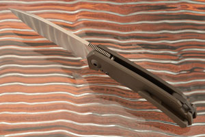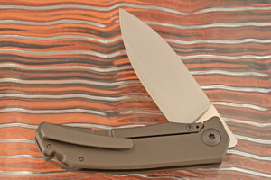 The blade runs on Trevor's in-house-made caged ceramic ball bearings and has silky-smooth action. Generally bearings are made either from tool steel or from stainless steel. Stainless steel can wear away, resulting in uneven action over time. Tool steel bearings can oxidize making the action rough. Ceramic bearings are the best of all worlds. Extremely hard and wear resistant, they are also inert and will not oxidize. The blade is easily opened single-handed using the gent's front flipper. This allows the blade to be flicked out quickly, or slowly rotated open with the thumb.