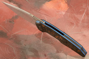 Handle scales are Orange Dark Matter FatCarbon. The custom external pivot is heat colored zirconium and is surrounded by a matching zirconium pivot collar. Jimping on the thumb ramp aids grip. The gently rounded handle feels sturdy and fills your hand perfectly. It is completed with blue anodized titanium liners surrounding a carbon fiber backbar. The 3D machined, heat colored zirconium pocket clip is mounted for tip-up, right-side carry.