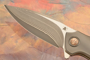 Handle scales are blackwood carbon fiber, fit perfectly to heat colored zirconium bolsters. Zirconium is a transitional metal that is primarily mined in South Africa and Australia. It is resistant to corrosion and scuffing. A black zirconium pivot collar surrounds a superconductor external pivot. Bronze anodized titanium liners surround a carbon fiber backbar. The zirconium pocket clip is mounted for right-side, tip-up carry.