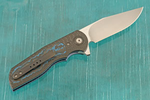 The handle is carbon fiber and features Arctic Storm FatCarbon inlaid into each side. Jewel polished and blue anodized titanium liners surround a textured zirconium backbar. A blackened zirconium pivot collar surrounds the external pivot. The 3D machined blackened titanium pocket clip is mounted for right-side, tip-up carry.
