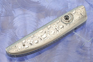 Handle scales are stainless damascus forged by Damasteel in Sweden. This stainless damascus is created using powder metallurgical steel manufacturing to provide unmatched beauty. Des hardened the scales to ensure they are more scuff resistant. Hand fileworked, anodized titanium liners keep this folder rigid, yet light.