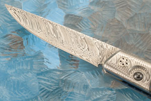 Blade: Stainless damascus forged by Damasteel, hardened, sub-zero quenched, and double tempered by Des for excellent edge retention