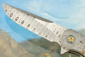 The hollow ground blade is Hugin pattern damascus forged by Damasteel in Sweden. It has smooth, drop shut action and is easily opened with one hand using the ambidextrous flipper toggle. It uses the IKBS (Ikoma Korth Bearing System) pivot system. This mechanism, which was originally designed to fit balisong knives, uses ball bearings to create exceptional action with no blade play. This special folder is made with ceramic ball bearings. Generally, IKBS bearings are made either from tool steel or from stainless steel. Stainless steel can wear away, resulting in uneven action over time. Tool steel bearings can oxidize making the action rough. Ceramic bearings are the best of all worlds -- extremely hard and wear resistant, they are also inert and will not oxidize.