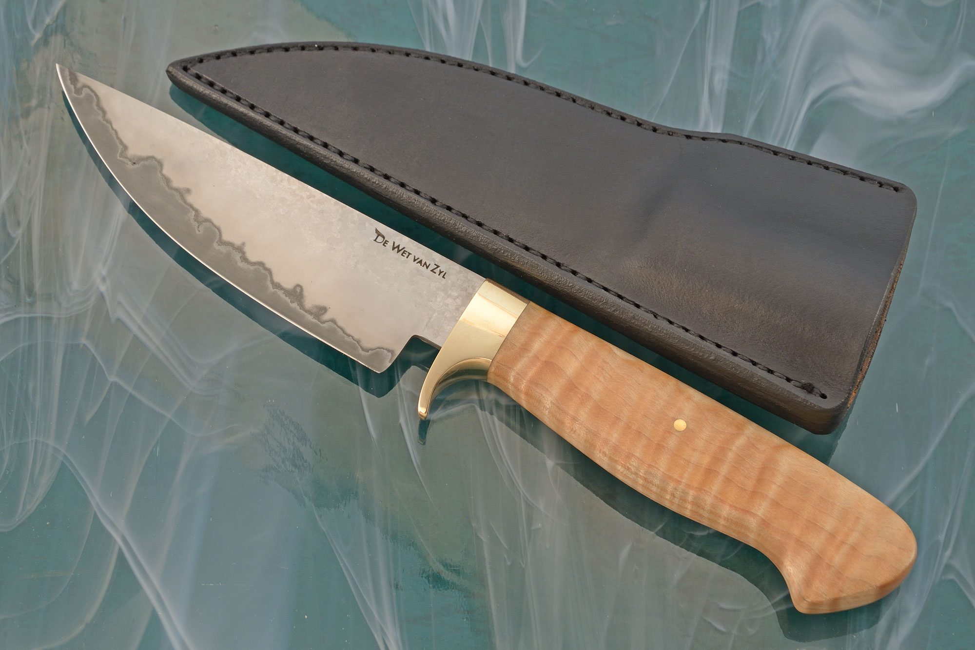 The handle is stabilized curly maple, perfectly set against the brass guard. The handle is nicely contoured for a secure, comfortable grip.