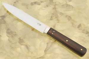 Ebony handle scales are secured to the full tang using four brass pins. The tang is distal tapered providing excellent balance in hand. The contoured handle fills your hand and is very comfortable.
