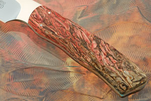 The dramatic handle is dyed and stabilized hemp fiber. The scales are contoured by hand and fill your hand for a comfortable grip. From skinning to field processing, to cooking around the campsite, this knife has you covered!