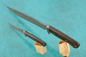 This matching Piggyback Set shows Jean's incredible skills at work. The matching blades are hand forged 1095 carbon steel featuring a hand rubbed satin finish. 1095 provides a nice balance of high edge holding and chip resistance. Borrowing from the world of Japanese swords, Jean coated the spine with clay prior to heat treatment. The clay acts as a heat sink, keeping the spine softer and supportive, while allowing the edge to be exceptionally hard. The undulating heat treatment line seen in the blade is called a hamon. The blade is distal tapered and feels exceptional in the hand. The spine is nicely rounded for comfort. The Large camp knife has a blade length of 9-1/2 inches with an overall length of 14.7 inches. The smaller hunter has a blade length of 3.9 inches with an overall length of 8.1 inches.