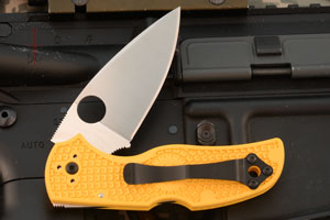 The lightweight, injection-molded, fiberglass-reinforced-nylon (FRN) handle is set on a high-strength back lock mechanism. The four-way pocket clip and hole opening make this knife completely ambidextrous. The handle proudly showcases the characteristic high-visibility yellow color of Spyderco's Salt Series and their signature Bi-Directional Texture pattern that ensures a positive grip both in and out of the water.