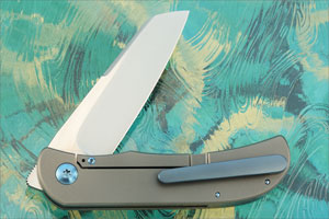 The handle is bead blasted Grade 5 titanium. Trevor's maker mark is engraved into the inside of the handle. The 3D machined titanium pocket clip is mounted for right-side, tip-up carry.