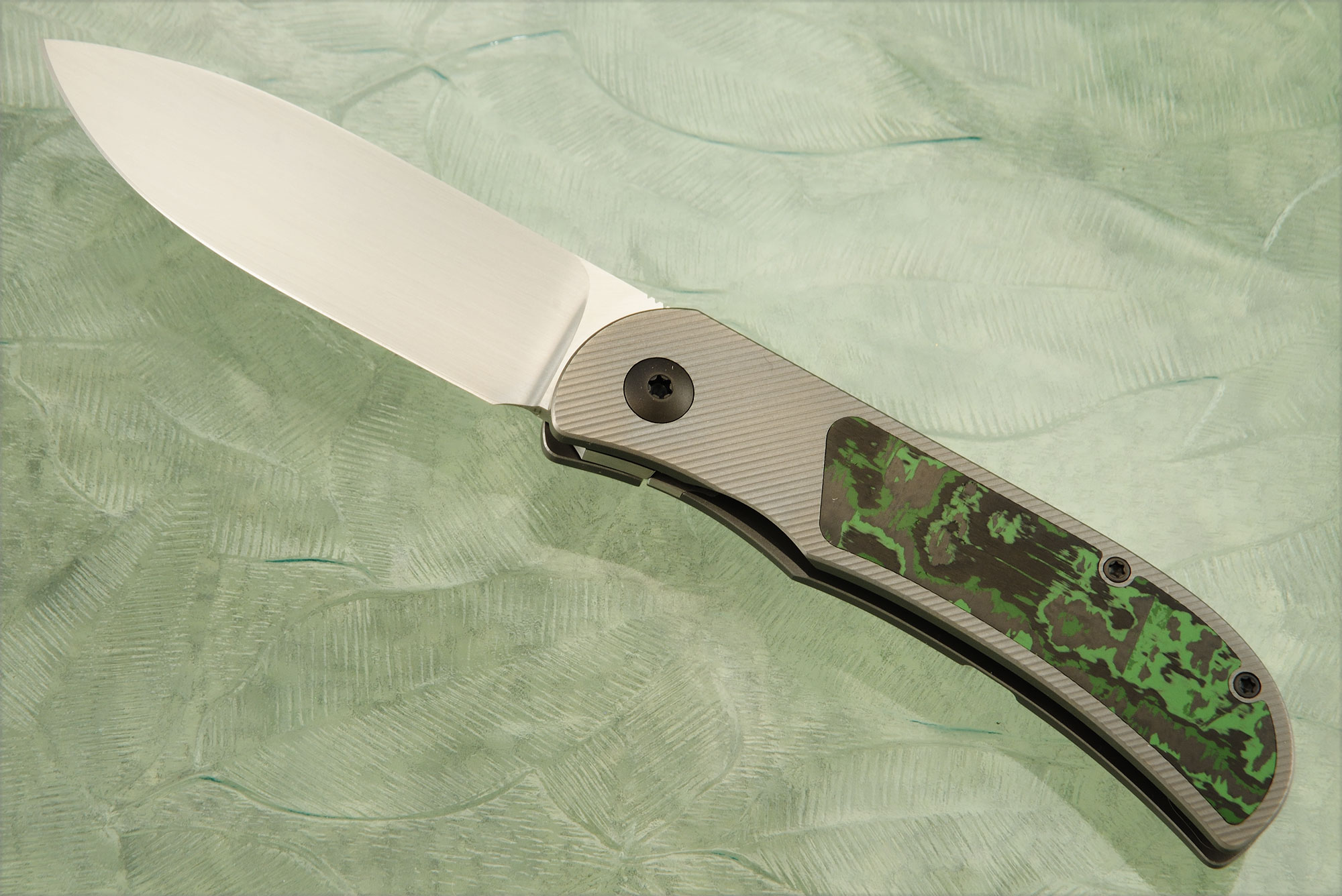 Handle: Bead blasted titanium with a Jungle Wear FatCarbon inlay