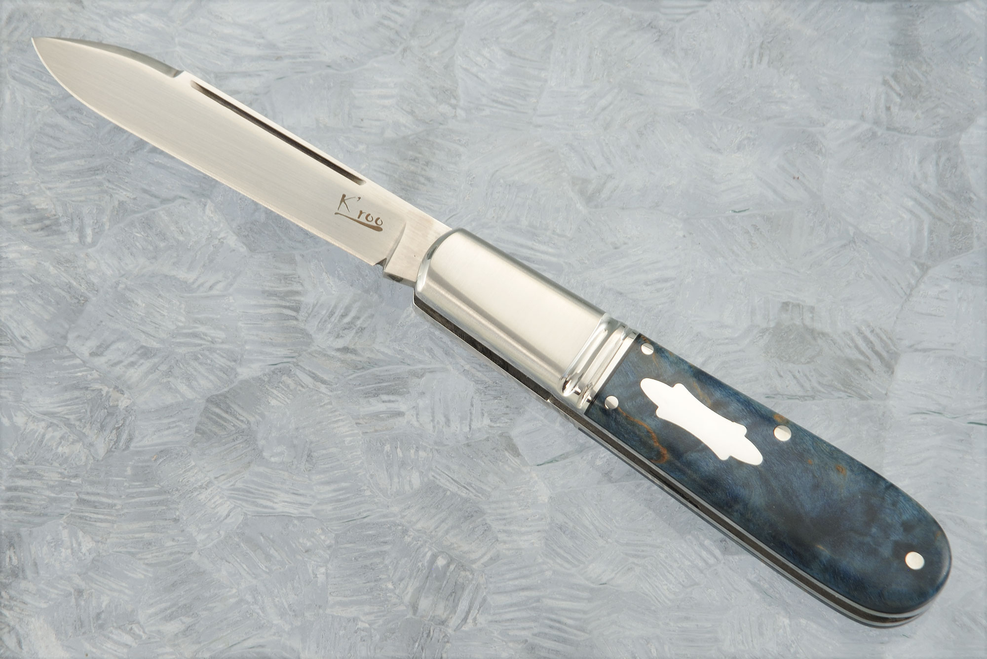 Handle scales are stabilized and dyed maple burl set on stainless steel liners. A polished stainless steel escutcheon is inlaid into the left scale. The inlay is flawless with no visible gapping. The handle is finished with polished and fluted stainless steel bolsters.