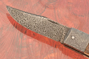 The 2-3/4 inch blade is mosaic explosion damascus forged by Mike from O1 and L-6 carbon steels to ensure high edge holding and chip resistance. The high contrast pattern is extremely engaging and will have you staring at it for hours. The knife can be easily opened using the left-side nail nick.