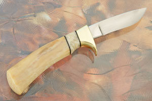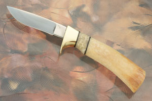 This rare hunter from Burke features an ancient walrus ivory handle with a muskox horn front spacer. The 6,000-10,000 year old ivory combines cream and caramel tones. Muskox horn is one of the most rare and majestic handle materials used in the knife world. The highly polished horn has a unique grain structure that immediately grabs the eye. A brass guard protects your fingers from sliding forward onto the blade.