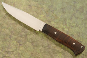 Handle scales are roasted curly sugar maple, secured to the full tang. The distal tapered blade and tang provide perfect balance. The contoured handle fills your hand and provides a comfortable grip. A lanyard can be added to the back of the knife if extra retention is desired.