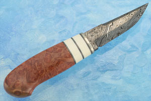 The handle is sculpted from rare red ivory burl. The swirling figure of the wood nicely complements the damascus blade. Large spacers of faux ivory are surrounded by stacked black fiber and nickel silver spacers. A hammer textured nickel silver guard completes the handle.