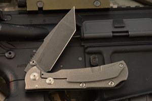 The blade is premium CPM-154 stainless steel, hardened to 59-61 Hrc and featuring a black oxide finish. This powdered metallurgical steel has a particularly small grain structure, making it take an extremely keen edge and hold it, while remaining tough and chip resistant. The blade can be easily opened using the dual thumbstuds which also act as a blade stop.