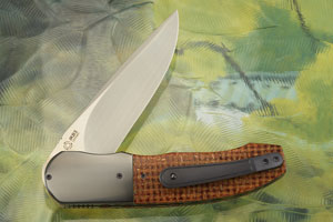 Handle scales are Thunderstorm Kevlar. Jimping on the thumb ramp provides a comfortable, secure grip. The gently rounded handle feels sturdy and fills your hand perfectly. Heat colored zirconium bolsters provide an elegant accent. Zirconium is a transitional metal that is primarily mined in South Africa and Australia. It is resistant to corrosion and scuffing. Fileworked titanium liners are anodized and surround a black G-10 backbar. The 3D machined TiAlN titanium pocket clip with ceramic retention ball is mounted for right-side, tip-up carry.