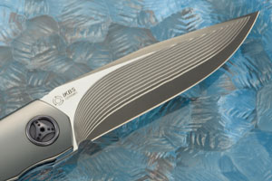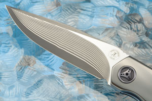 Handle scales are carbon fiber. Jimping on the thumb ramp provides a comfortable, secure grip. The gently rounded handle feels sturdy and fills your hand perfectly. Heat colored zirconium bolsters provide an elegant accent. Zirconium is a transitional metal that is primarily mined in South Africa and Australia. It is resistant to corrosion and scuffing. The bolsters feature a custom external zirconium pivot and collar. Titanium liners are anodized and surround a black G-10 backbar. The 3D machined TiAlN titanium pocket clip with ceramic retention ball is mounted for right-side, tip-up carry.