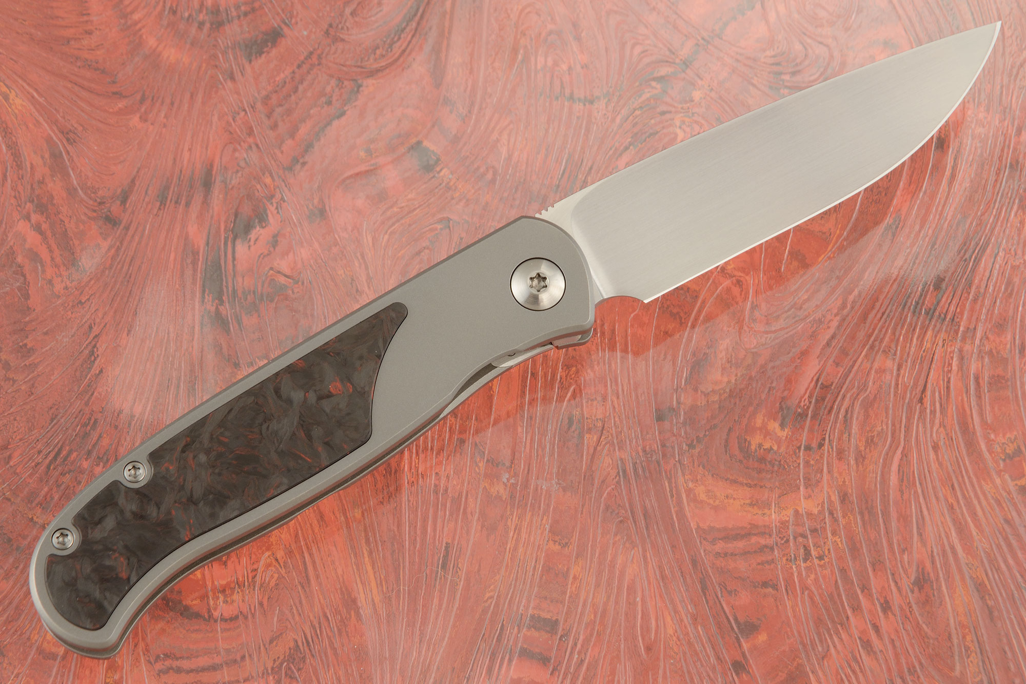 The handle is bead blasted grade 5 titanium with a Red Dark Matter FatCarbon inlay on the show side. Trevor's touchmark is engraved on the inside of the handle. The 3D machined titanium pocket clip is mounted for right-side, tip-up carry.