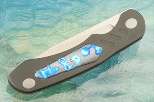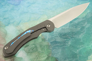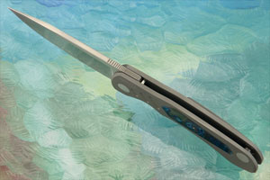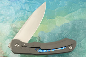 The handle is bead blasted 6Al4V titanium. The frame surrounds an oversized barrel spacer that keeps the knife light, yet strong. Sections of Black Timascus (titanium/zirconium damascus) are inlaid into both sides of the knife, mounted with internal hardware. The 3D machined titanium pocket clip is mounted for right-side, tip-up carry.