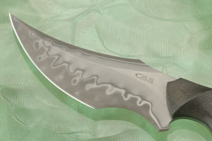 The blade was hand forged from 1095 carbon steel surrounded by 420 stainless steel. This technique, known as san mai (three layers) provides the performance of 1095 carbon steel with the lower care offered by stainless steel sides. The transition between the hard center core and the softer sides is particularly dramatic. A deep recurve increases cutting power dramatically.