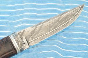 The 4-1/2 inch blade is forged to shape from Micke's own multi-bar damascus. He combined a bar of twist damascus, a linear nickel stripe, and a firecracker pattern edge. The damascus is forged from Uddeholm 15N20 and 20C carbon steels for exceptional edge holding. Micke's touchmark is on the right ricasso.