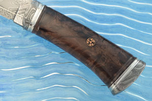 The handle is dyed and stabilized maple burl, secured with a large mosaic pin. The contoured handle fills your hand and provides a comfortable grip. Both the front and rear bolsters are matching twist pattern damascus. Fluted and polished stainless steel spacers finish the handle.