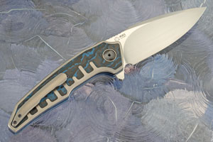 Titanium handle scales are inlaid with Arctic Storm FatCarbon on both sides. The skyline inlays are exceptionally well done. Jimping on the thumb ramp aids grip. The slim profile handle feels sturdy and disappears in your pocket. The custom external pivot is zirconium and features an integral titanium pivot collar. 3D machined titanium pocket clip is mounted for tip-up, right-side carry.