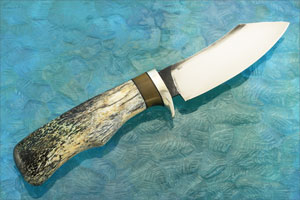 The blade is hand forged 1084 carbon steel. 1084 carbon steel is tough, chip resistant, and maintains excellent edge holding. The blade features a hand rubbed satin finish in the grinds and forge texturing on the flats. Will's touchmark is on the right side of the blade. Because this knife is forged from carbon steels, we recommend using camellia oil to oil the blade and natural stag handle.